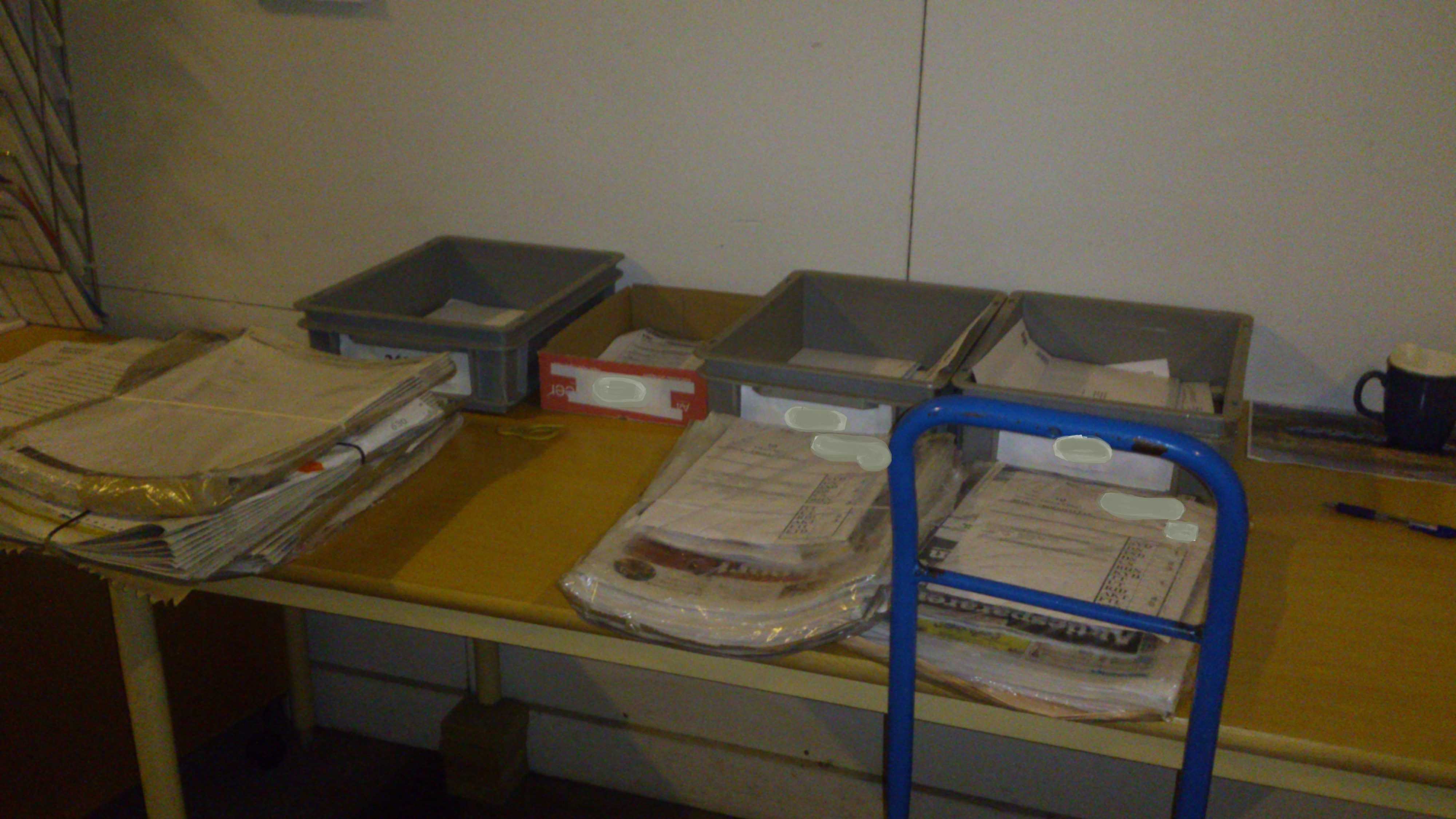 Våra arbetsytor där vi skall dubbelkolla våra tidningar och kontrollera posten har också blivit mer ergonomiska genom att placera träklossar under benen.